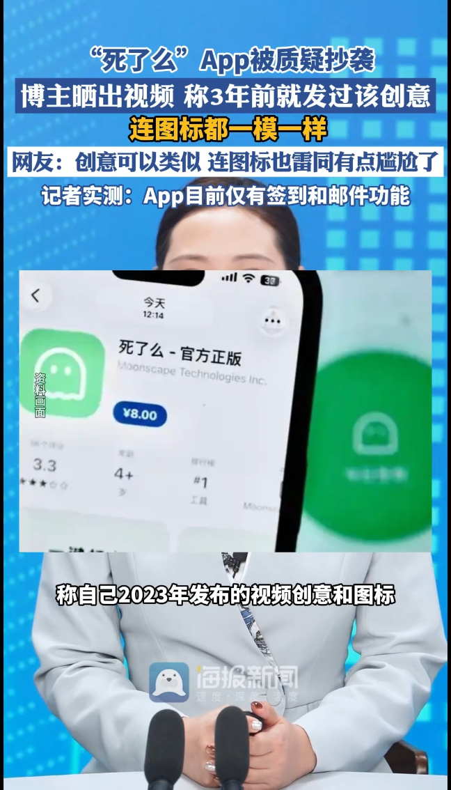 一款名为“死了么”的App最近火了,但“抄袭”的争议也随之而来!短视频博主“摆货小天才”晒出对比,称自己2023年发布的视频创意和图标,与这款新App雷同。