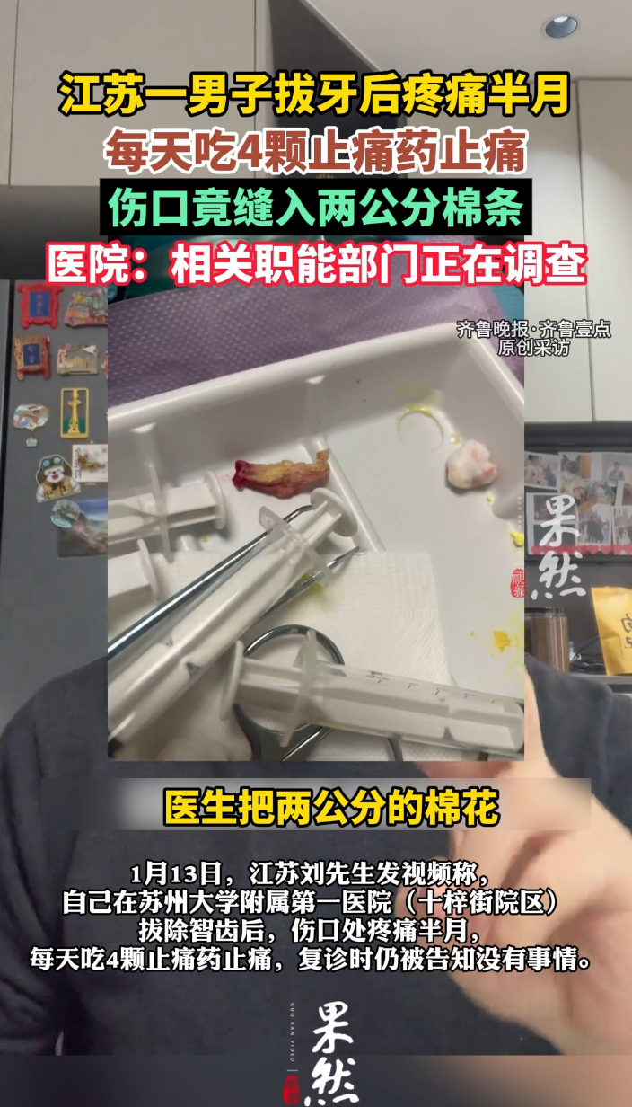果然视频|苏州男子拔牙伤口有棉花,医院:自己咬进去的