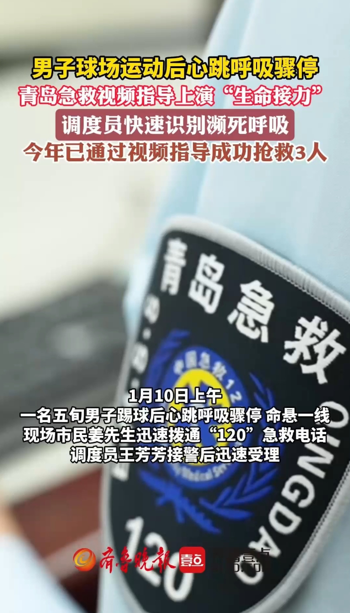 果然视频丨男子运动后心跳呼吸骤停!青岛120视频指导急救齐鲁晚报·齐鲁壹点客户端 15:17原创1月10日上午,一名五旬男子踢球后心跳呼吸骤停,命悬一线。现场市民姜先生迅速拨通“120”急救电话。调度员王芳芳接警后迅速受理,与现场众人、康复大学青岛中心医院急救站、急诊科紧密联动,上演了一场争分夺秒的生命接力。后经医院急诊科工作人员反馈,患者生命体征恢复。据了解,这是2026年以来,青岛市急救中心调度员借助视频指导成功抢救的第3位患者。 (齐鲁晚报•齐鲁壹点 刁明杰)