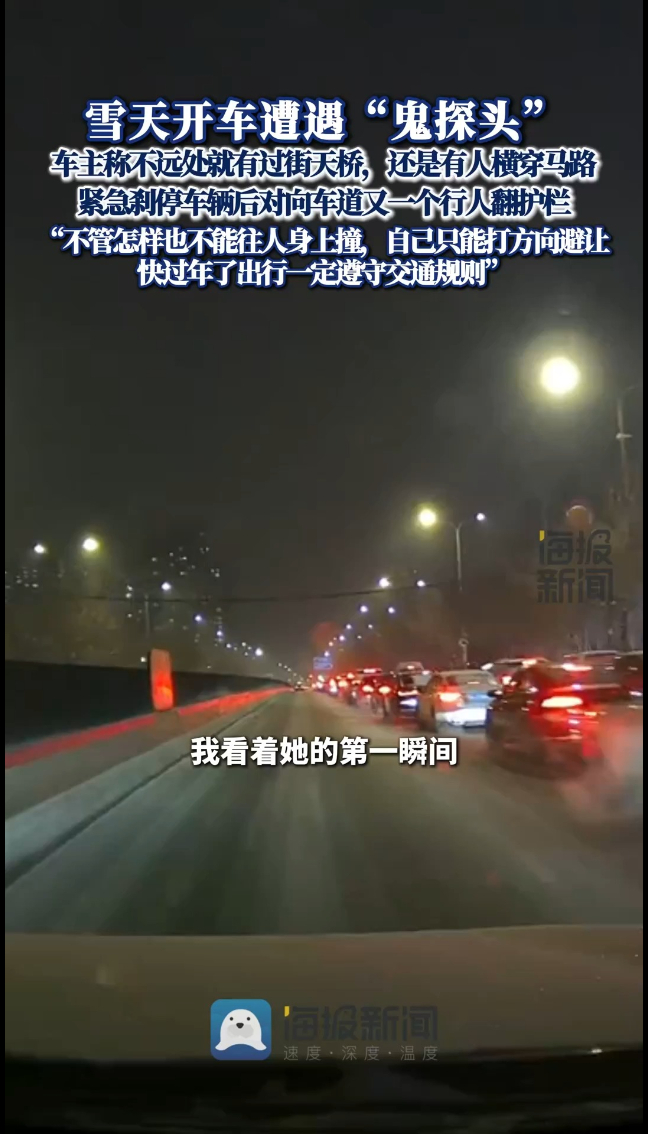 雪天开车遭遇“鬼探头”,车主:“不管怎样也不能往人身上撞,快过年了出行一定遵守交通规则”