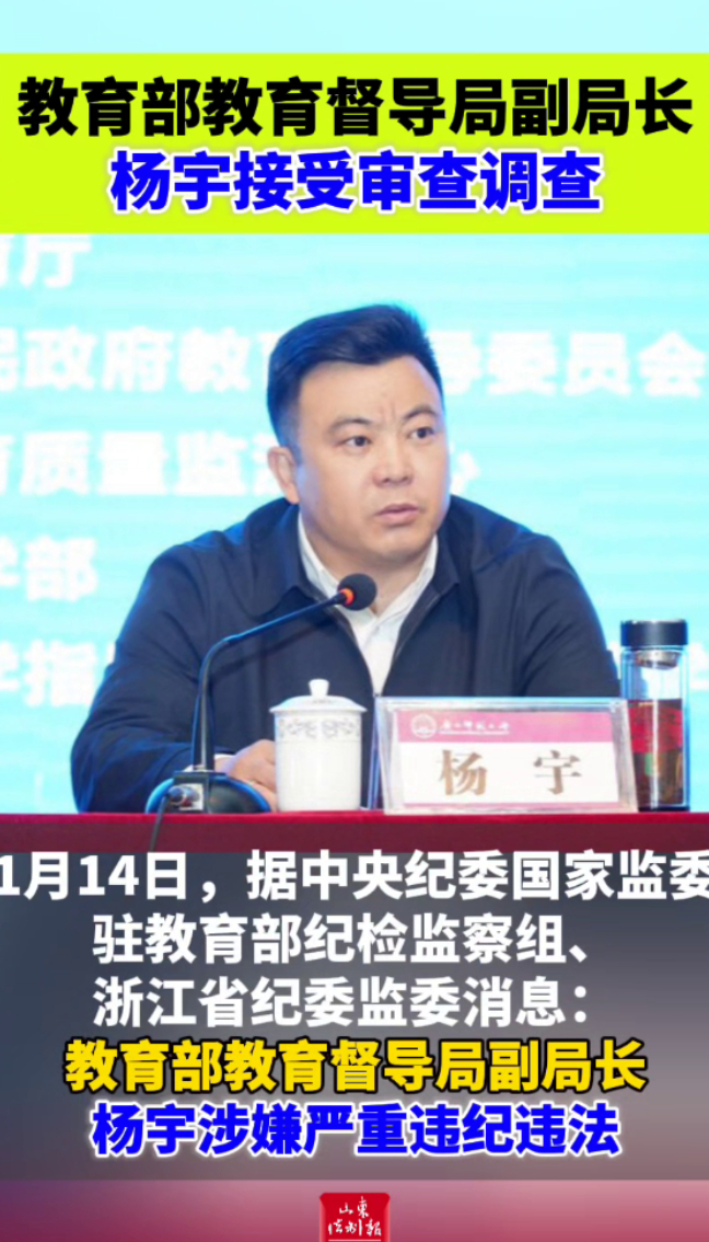 教育部教育督导局副局长杨宇接受审查调查 20:09 大众新闻·山东法制报 微信扫码扫码下载客户端1月14日,据中央纪委国家监委驻教育部纪检监察组、浙江省纪委监委消息:教育部教育督导局副局长杨宇涉嫌严重违纪违法,目前正接受中央纪委国家监委驻教育部纪检监察组纪律审查和浙江省丽水市监委监察调查。