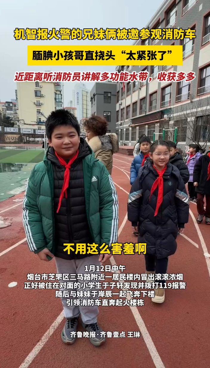 果然视频|机智报火警的兄妹俩被邀参观消防车,小孩哥紧张直挠头齐鲁晚报·齐鲁壹点客户端 昨天22:41原创1月12日中午,烟台市芝罘区三马路附近一居民楼内冒出滚滚浓烟。住在对面的小学生于子轩发现火情并拨打119报警,随后与妹妹于岸辰一起飞奔下楼,引领消防车直奔起火楼栋。1月14日,烟台市莱山区观海路消防救援站的消防员们来到潇翔小学为兄妹俩送上礼物,并邀请同学们参观消防车。 (齐鲁晚报·齐鲁壹点 王琳)