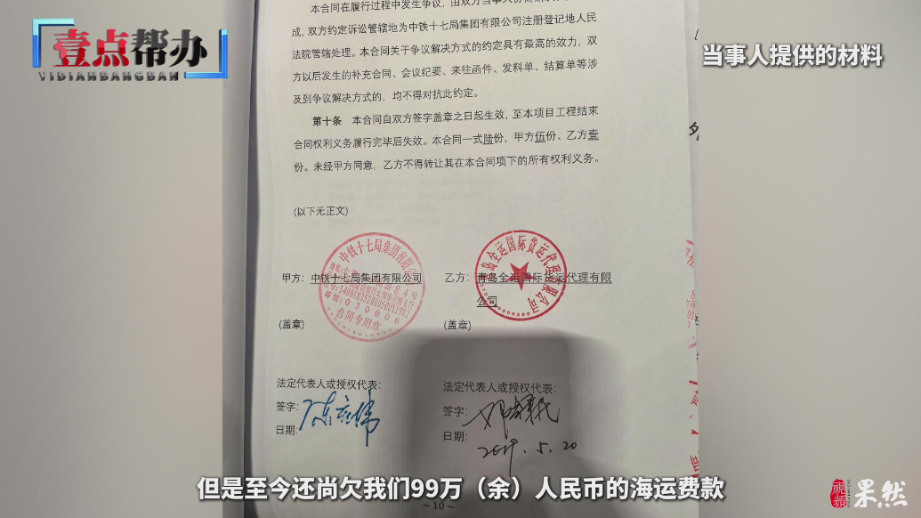壹点帮办|拖欠百万运费数年玩“失踪”?中铁十七局:春节前付清 09:28 原创齐鲁晚报·齐鲁壹点客户端 微信扫码扫码下载客户端近日,青岛全运国际货运代理公司负责人于女士向齐鲁晚报·齐鲁壹点(报料电话:0531-85193700;报料平台:“壹点帮办”微信小程序)反映称,中铁十七局集团拖欠他们公司百万元运费数年,至今未结,还玩起了“失踪”,电话不接,找不到人。对此,中铁十七局该项目负责人回应壹点帮办称,公司资金紧张,争取春节前付清。(齐鲁晚报·齐鲁壹点 赵波 刁明杰)