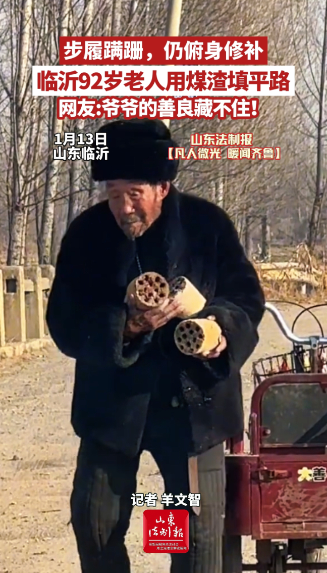 步履蹒跚,仍俯身修补,临沂92岁老人用煤渣填平路,网友:爷爷的善良藏不住!