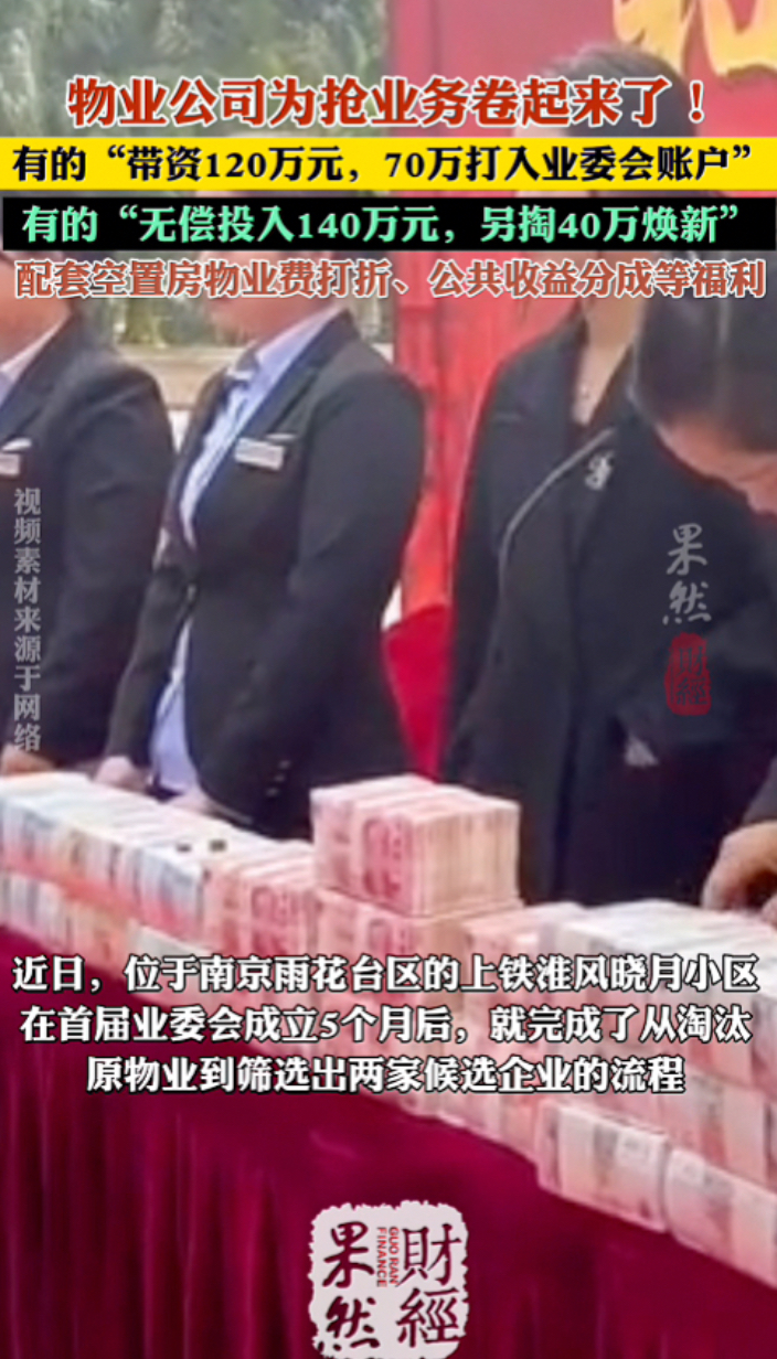 果然财经|无偿投入百万元,另掏40万焕新,物业公司也卷起来了齐鲁晚报·齐鲁壹点客户端 13:08原创近日,位于南京雨花台区的上铁淮风晓月小区,在首届业委会成立5个月后,就完成了从淘汰原物业到筛选出两家候选企业的流程。据每日经济新闻,根据淮风晓月业委会对外披露的文件,共有6家品牌物企参与竞逐,最终奥体物业与美的物业进入终极PK,两家企业分别抛出带资140万元、120万元进场的重磅方案
