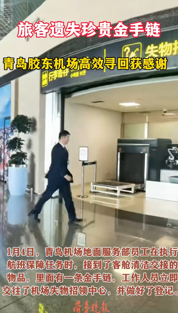 果然视频丨旅客遗失珍贵金手链,青岛胶东机场高效寻回获感谢信齐鲁晚报·齐鲁壹点客户端 15:00原创1月4日,青岛机场地面服务部员工在执行航班保障任务时,接到了客舱清洁交接的物品,里面有一条金手链。当天下午,失主路先生打来求助电话称,自己一条珍贵的金手链丢了,请求寻找。经过紧张而细致的比对,这条手链确系路先生的失物。1月5日下午,路先生的家属专程赶到机场,手中除了相关证件,还有一封沉甸甸的感谢信。(齐鲁晚报·齐鲁壹点记者 赵波)