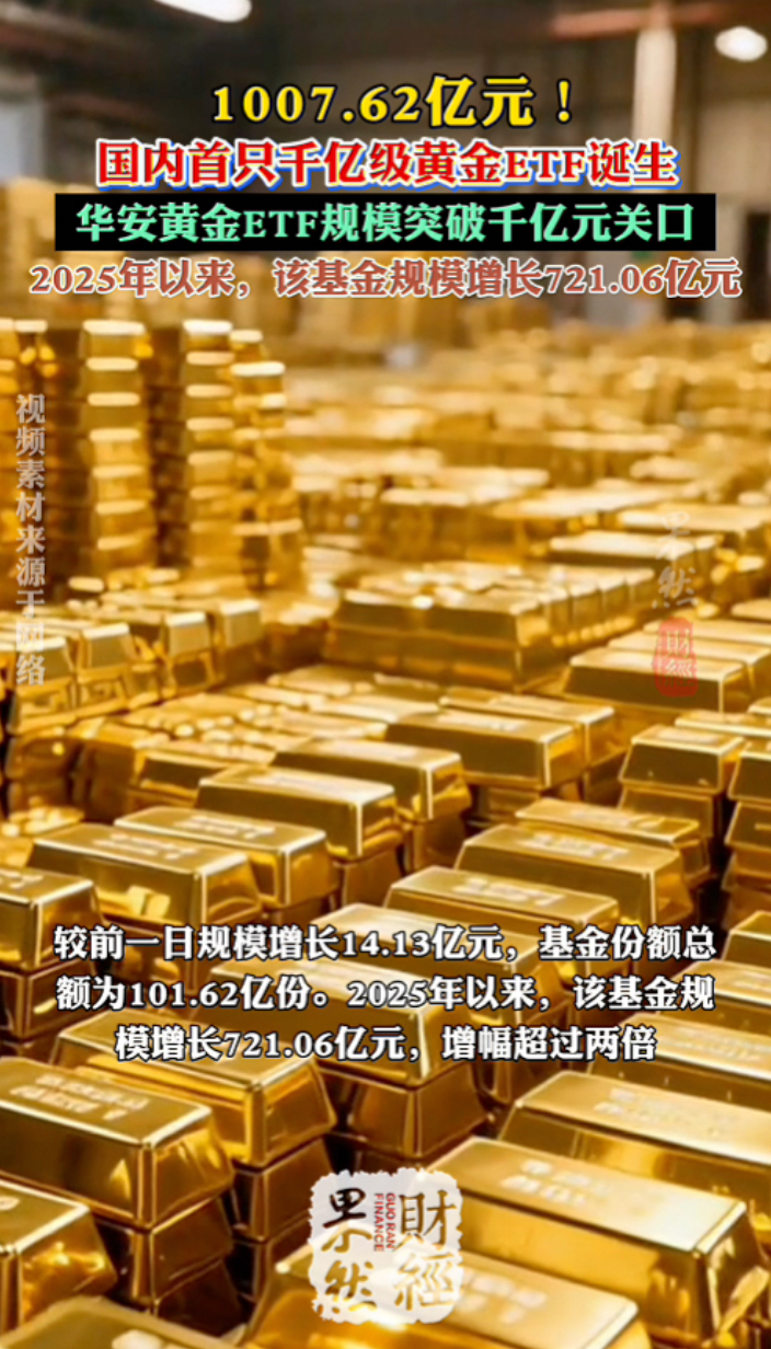 果然财经|1007.62亿元!国内首只千亿级黄金ETF诞生齐鲁晚报·齐鲁壹点客户端 15:57原创随着金价持续攀升和资金的流入,国内迎来首只千亿级的黄金ETF。Wind数据显示,截止1月14日,华安黄金ETF规模突破千亿元关口,为1007.62亿元,较前一日规模增长14.13亿元,基金份额总额为101.62亿份。2025年以来,该基金规模增长721.06亿元,增幅超过两倍。