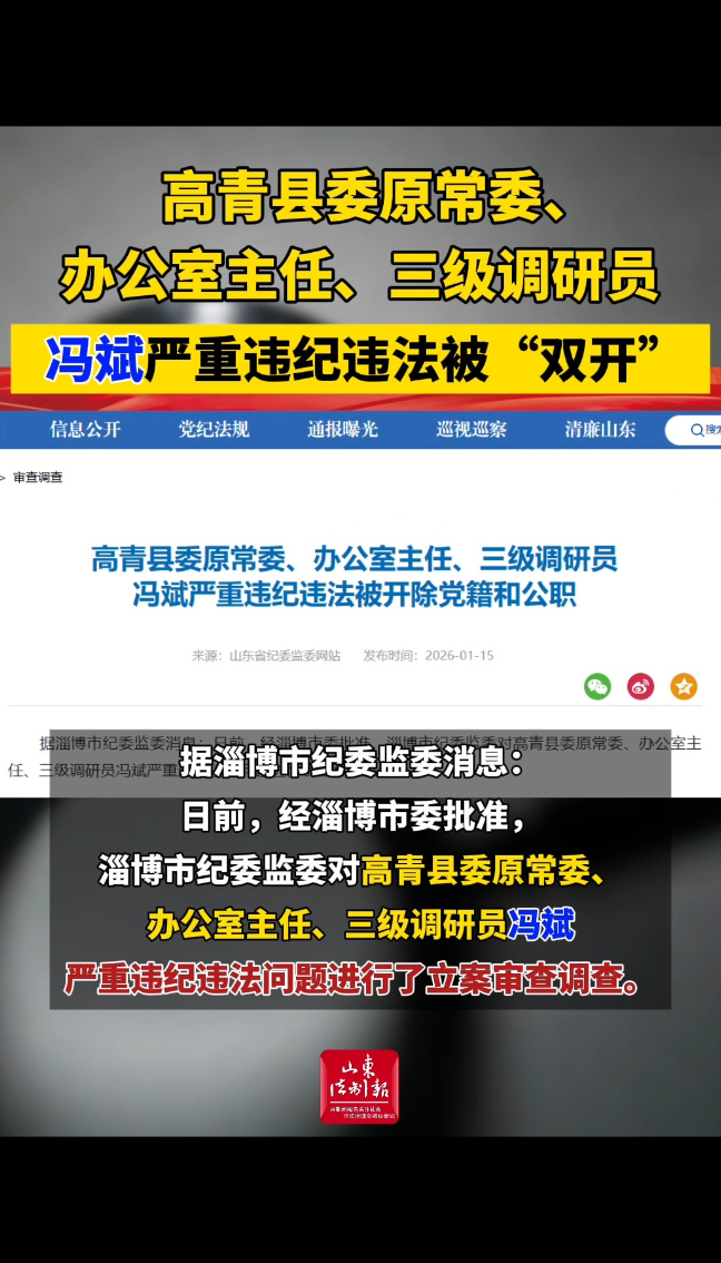 据淄博市纪委监委消息:日前,经淄博市委批准,淄博市纪委监委对高青县委原常委、办公室主任、三级调研员冯斌严重违纪违法问题进行了立案审查调查。
