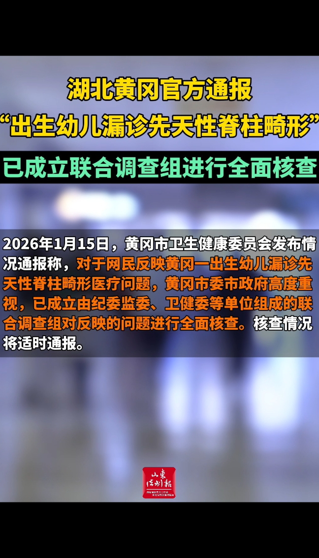 2026年1月15日,黄冈市卫生健康委员会发布情况通报称,对于网民反映黄冈一出生幼儿漏诊先天性脊柱畸形医疗问题,黄冈市委市政府高度重视,已成立由纪委监委、卫健委等单位组成的联合调查组对反映的问题进行全面核查。核查情况将适时通报。