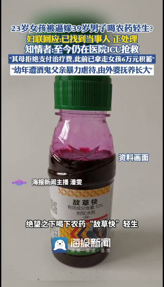 23岁女孩疑因被母亲逼迫嫁给一名39岁男子,绝望之下喝下农药“敌草快”轻生,至今仍在武汉协和医院ICU抢救,确诊多器官衰竭。