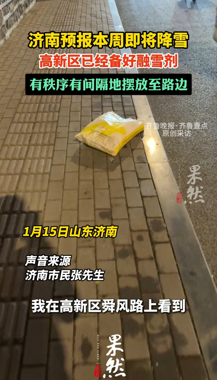 果然视频|“未雪绸缪”,随时上岗,济南高新区路上已摆好融雪剂齐鲁晚报·齐鲁壹点客户端 18:48原创1月15日,天气预报预测济南本周即将迎来降雪。市民张先生发现,高新区舜风路上已经有秩序有间隔地准备好了融雪剂摆放至路边。以便第一时间融雪,避免雪天路滑影响市民通行。(齐鲁晚报·齐鲁壹点 郭辰昊)