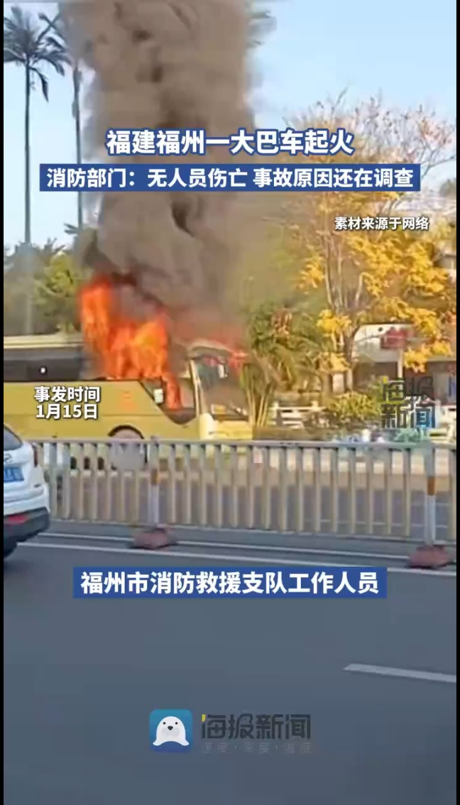 1月15日下午3时许,福建省福州市北二环中路一辆大巴车突发火情。大巴车身起火,现场浓烟滚滚。