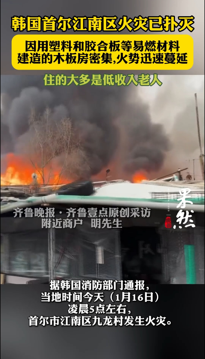 果然视频|韩国首尔火灾已扑灭,消防部门正在清理余火齐鲁晚报·齐鲁壹点客户端 15:14原创1月16日凌晨5时许,首尔江南区开普洞九龙村发生大规模火灾,火势迅速蔓延。因当地多为石棉瓦、胶合板搭建的密集棚屋,加之道路狭窄,消防车难以进入,灭火一度受阻。经近7小时奋战,火势于上午约11时30分基本扑灭,目前正清理余火。(齐鲁晚报·齐鲁壹点爆料电话:0531-85193656;邮箱:405617016@qq.com)