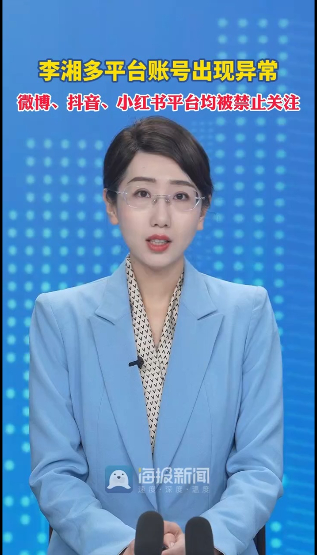 主播说丨李湘多平台账号出现异常,微博、抖音、小红书平台均被禁止关注 15:09 原创大众新闻·海报新闻 微信扫码扫码下载客户端1月16日,有记者查询发现,李湘账号在微博、抖音、小红书平台被禁止关注。据公开资料显示,李湘1976年出生于湖南,系知名主持人。2023年,李湘发文透露自己已经退休。目前,相关话题已登上热搜。(海报新闻综合红星新闻编辑 冯浩 潘雯 张光 张坤)