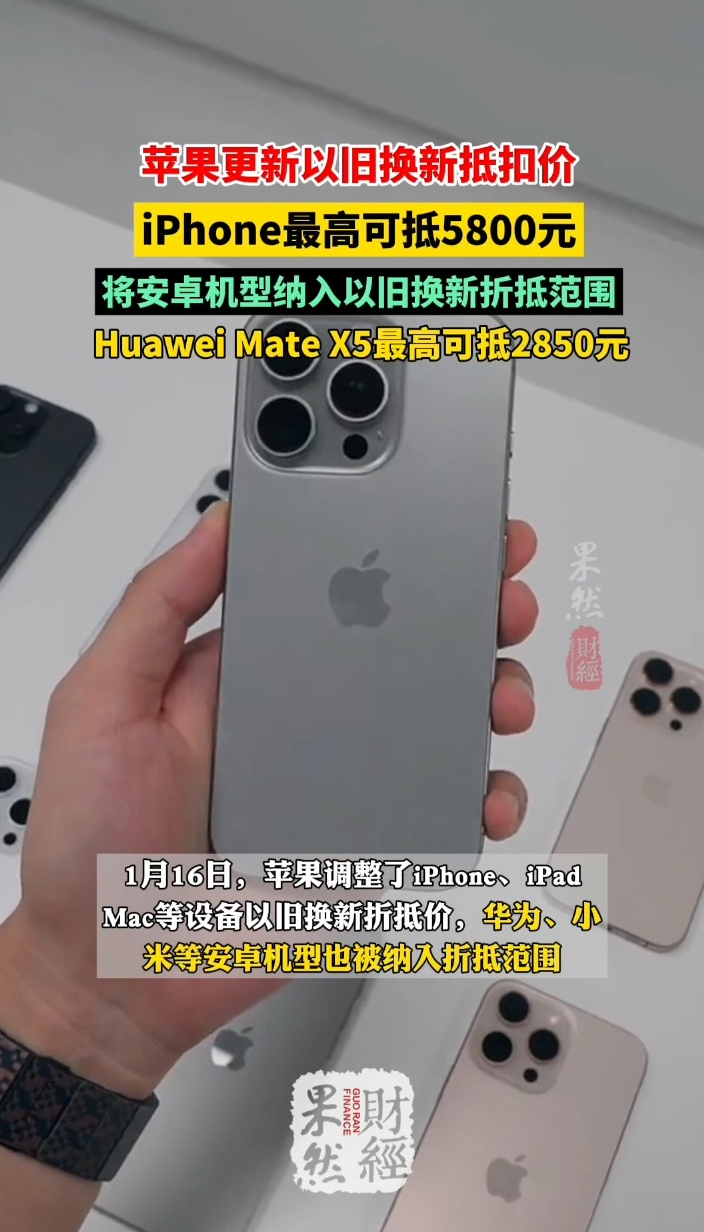 果然财经|苹果更新以旧换新抵扣价,安卓机型纳入折抵范围齐鲁晚报·齐鲁壹点客户端 16:02原创1月16日,苹果调整了iPhone、iPad、Mac等设备以旧换新折抵价,华为、小米等安卓机型也被纳入折抵范围,Huawei Mate X5最高可抵2850元;Huawei Mate 70 Pro+ 最高可抵2750元;Oppo Find X8 Pro最高可抵1700元;Vivo iQOO 13最高可抵1600元;Xiaomi 15 Pro最高可抵1600元。