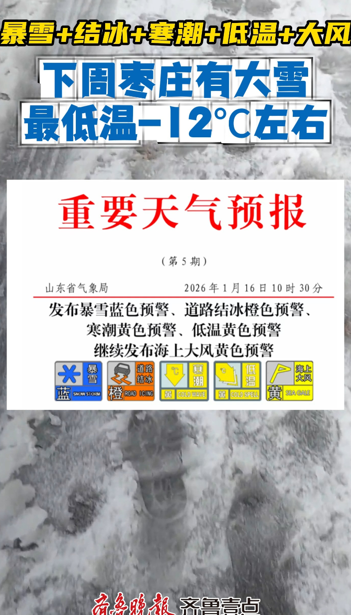 山东罕见五预警齐发,下周枣庄有大雪,最低温-12℃左右