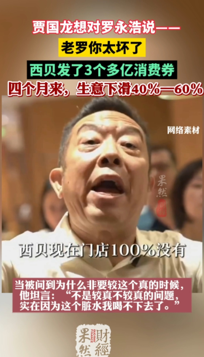 果然财经|生意下滑60%!贾国龙想对罗永浩说:老罗你太坏了齐鲁晚报·齐鲁壹点客户端 07:04原创近日,围绕西贝,预制菜,中央厨房,西蓝花以及罗永浩等问题,中国新闻周刊在北京采访了贾国龙。当被问到为什么非要较这个真的时候,他坦言:“不是较真不较真的问题,实在因为这个脏水我喝不下去了。”这四个月里,西贝的生意下滑了40%到60%不等,消费券一共发了3个多亿。他说,未来并不排斥与罗永浩面对面交流,见面第一句话会说:老罗你太坏了!