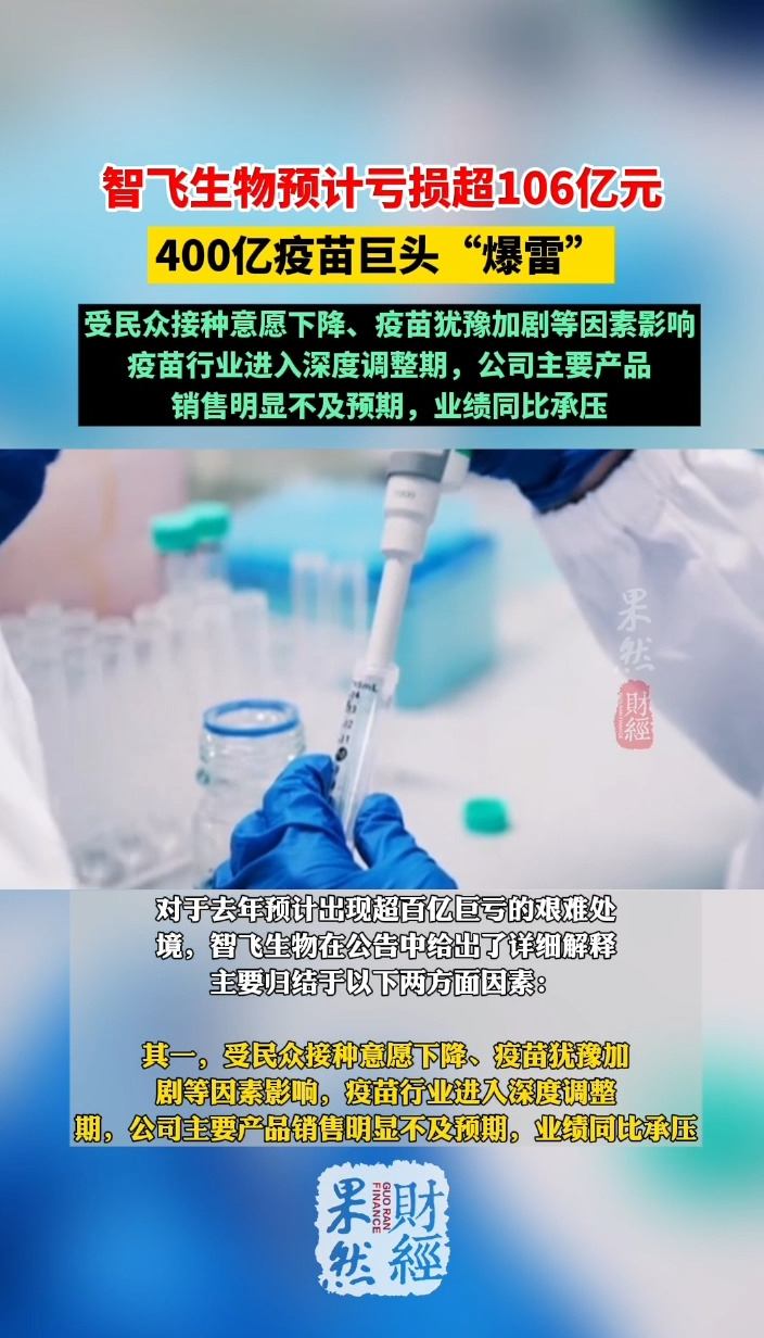 果然财经|预计亏损超106亿元,400亿疫苗巨头“爆雷”齐鲁晚报·齐鲁壹点客户端 10:52原创1月12日,智飞生物发布2025年度业绩预告,公司预计2025年录得归母净利润-106.98亿元至-137.26亿元,同比下降630%至780%;扣非净利润-105.54亿元至-135.41亿元,同比下降630%至780%。
