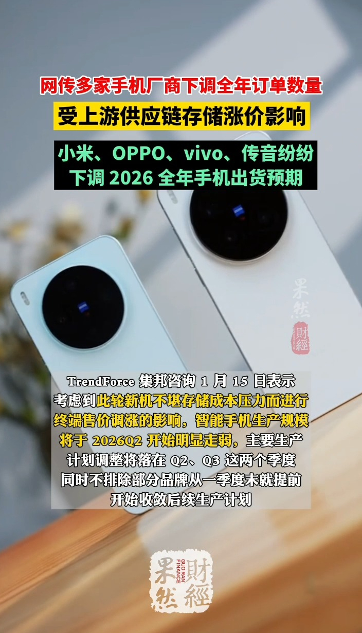 果然财经|多家手机厂商下调全年订单数量,小米下调超20%齐鲁晚报·齐鲁壹点客户端 10:53原创1 月 16 日消息,据界面新闻报道,受上游供应链存储涨价影响,多家手机厂商近日下调全年整机订单数量,小米、OPPO 下调超 20%,vivo 下调近 15%,传音下调至 7000 万台以下。各家下调机型主要都侧重在中低端和海外产品。对此消息,小米、OPPO、vivo、传音等厂商并未作出回应。