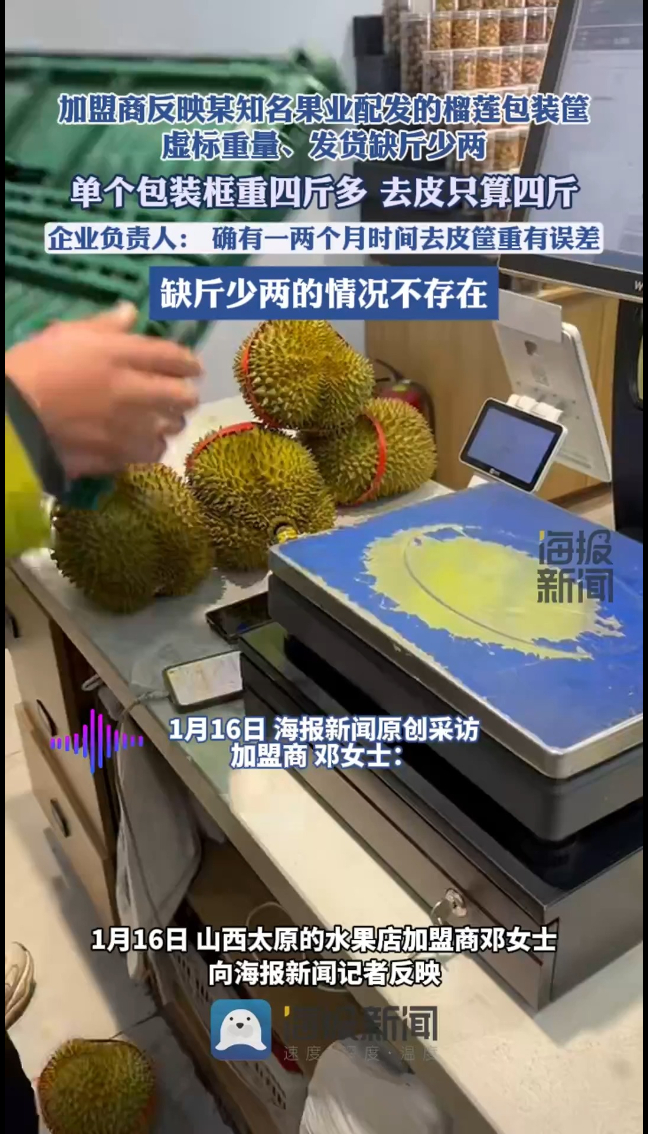 海报视讯丨加盟商反映某知名果业配发的榴莲包装筐虚标重量、供货缺斤少两,企业回应
