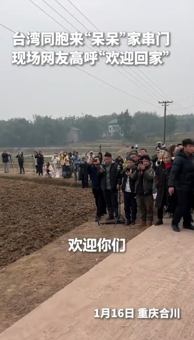 1月16日,重庆合川,台湾同胞到“呆呆”家串门,现场网友高呼“欢迎回家”。网友:“刨猪汤里话团圆!”