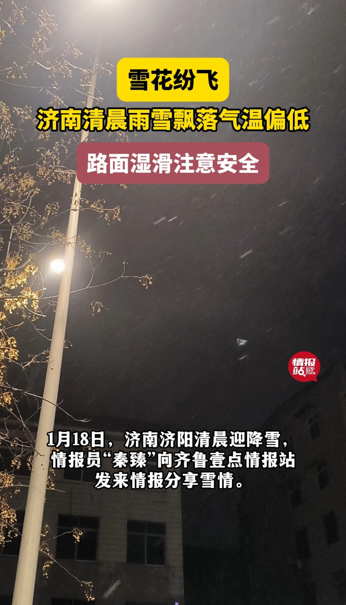 天气情报站|雪已开下!济南清晨雨雪飘落,路面湿滑出行注意安全齐鲁壹点 | 08:30 大众报业·齐鲁壹点 微信扫码扫码下载客户端1月18日,济南清晨迎降雪,情报员“秦臻”向齐鲁壹点情报站发来情报分享雪情。“今天早上,济南市济阳区开始下雪了,漫天飞舞的雪花纷纷扬扬,似洁白的羽毛飘然而下,随着气温和地面温度逐渐下降,机动车道路面湿滑,非机动车道和人行道路出行结冰,出行的市民朋友们,一定要注意安全和保暖。”情报员说。你所在的城市天气怎么样?欢迎来分享!