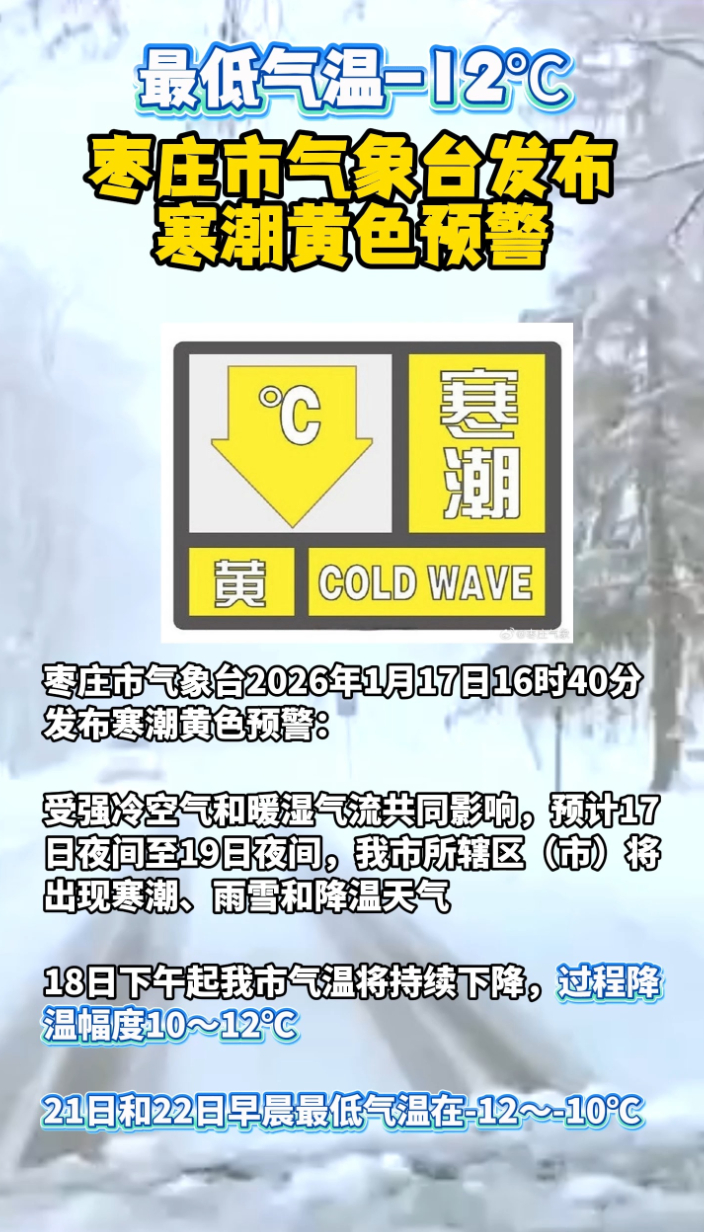 最低气温-12℃!枣庄市气象台发布寒潮黄色预警