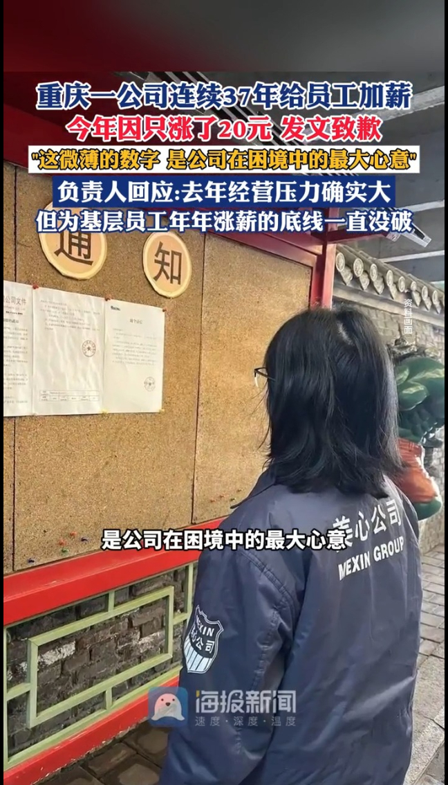 主播说丨重庆一公司连续37年给员工加薪 今年因只涨了20元 发文致歉 “这微薄的数字 是公司在困境中的最大心意” 负责人回应:去年经营压力确实大 但为基层员工年年涨薪的底线一直没破