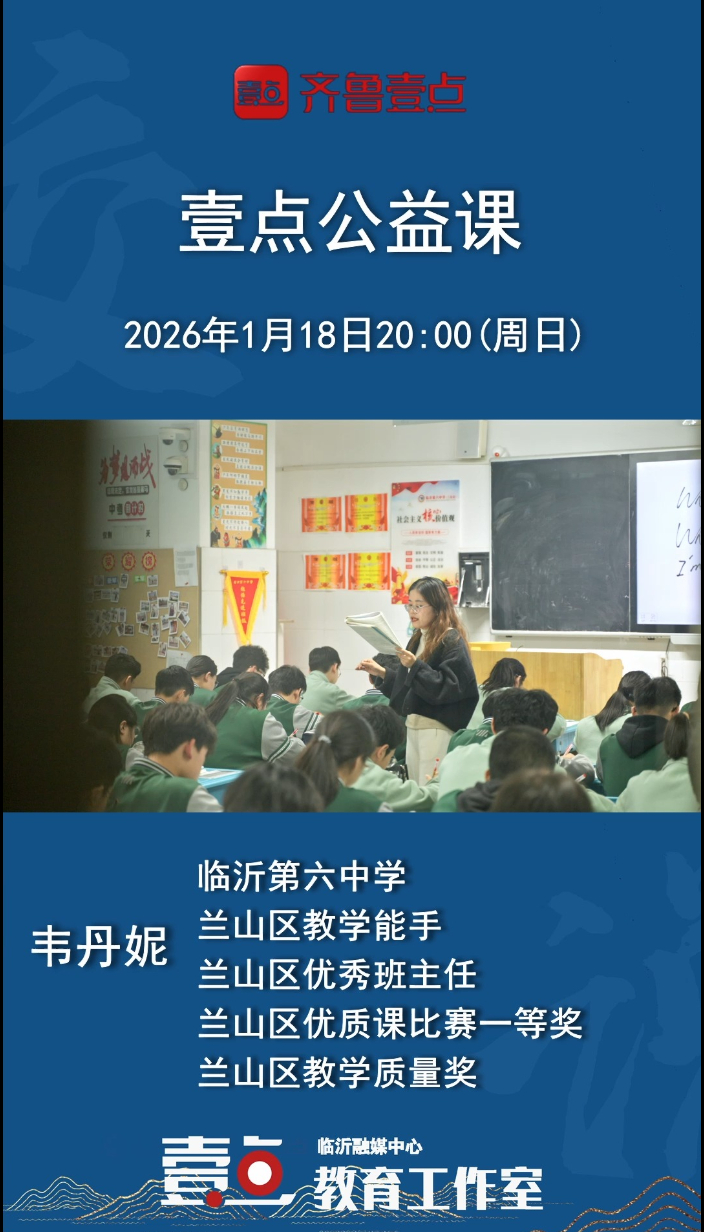 壹点公益课|中考英语完形填空如何突破?周日晚这位名师为你支招大众报业·齐鲁壹点 14:242026年,齐鲁晚报临沂融媒中心壹点教育工作室今年全新推出“名师导航,赢在中考”壹点公益课。1月18日(周日)20:00,临沂第六中学英语教师韦丹妮将走进直播间,带来专题课程:《中考英语完形填空解题指导》,帮助学生理清思路、掌握策略、提升解题效率。