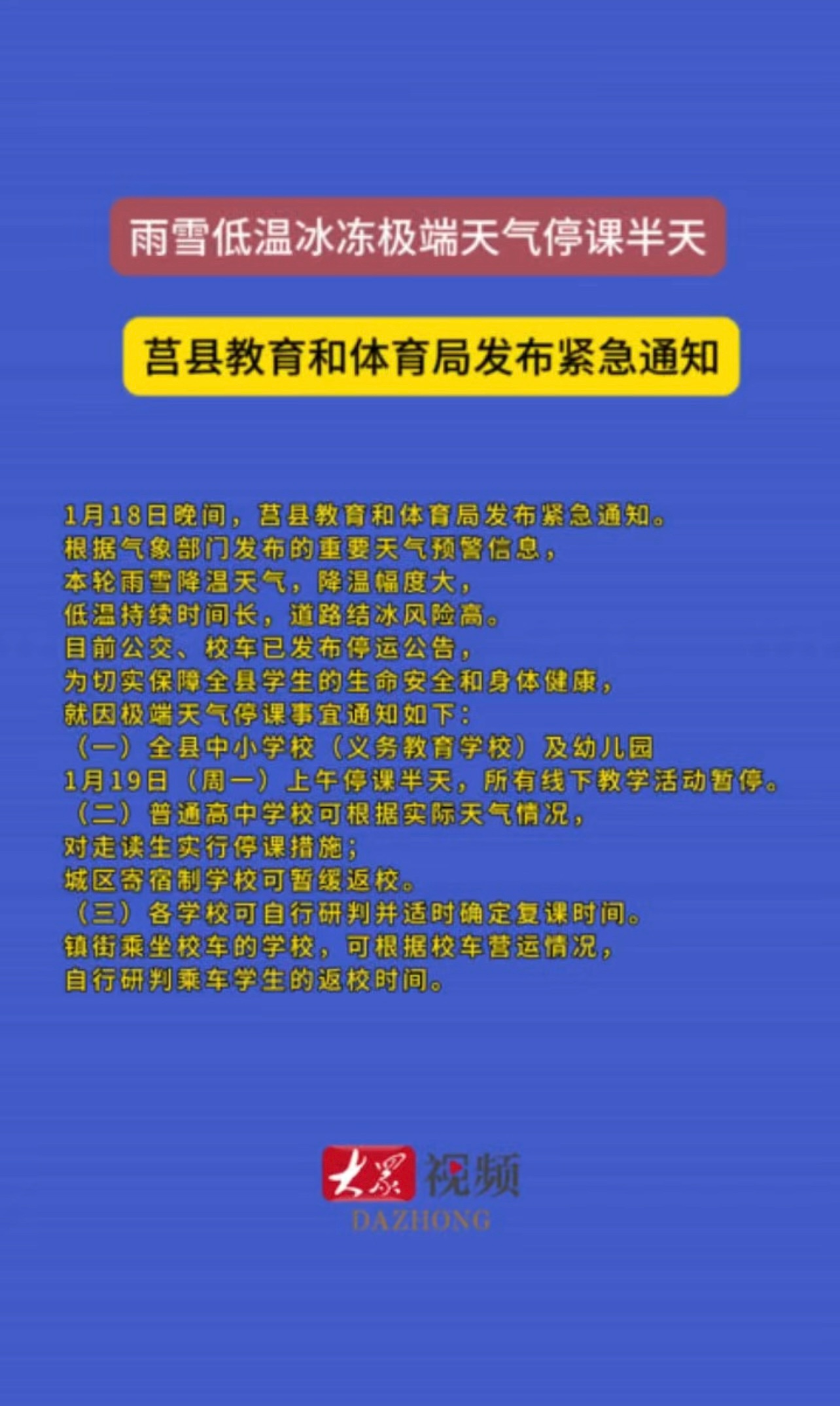 因雨雪低温冰冻极端天气停课半天!莒县教育和体育局发布紧急通知