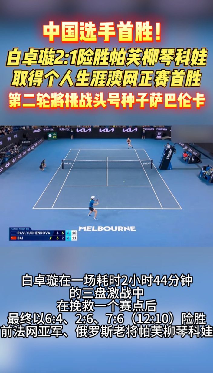 果然视频|白卓璇2:1险胜帕芙柳琴科娃,取得个人澳网正赛首胜 昨天22:41 原创齐鲁晚报·齐鲁壹点客户端 微信扫码扫码下载客户端1月18日,2026澳网展开女单首轮争夺。白卓璇在三盘激战后,最终以6:4、2:6、7:6(12-10)险胜前法网亚军、俄罗斯老将帕芙柳琴科娃,取得中国军团在本届赛事正赛首场胜利,同时也是她个人在大满贯正赛的第二场胜利。(齐鲁晚报·齐鲁壹点 怀晓)