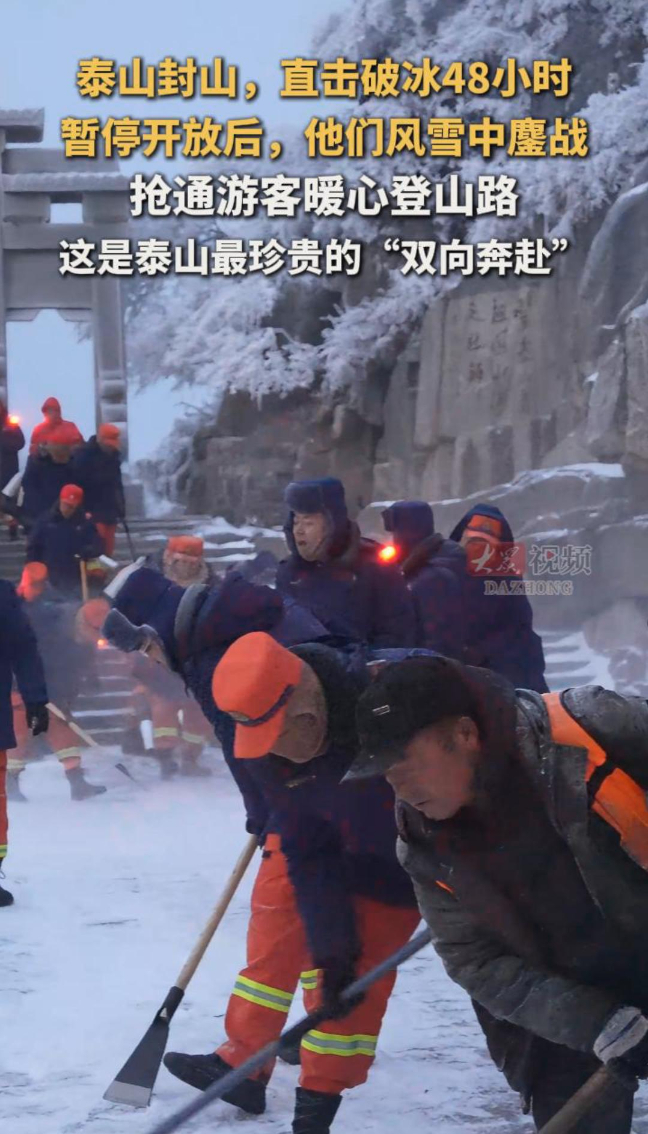 1月17日下午,因天气原因,泰山景区各游览线路暂停开放。为保障景区尽快恢复开放,景区工作人员连续两天浴雪奋战清扫道路。目前泰山景区仍处于临时封闭状态,请计划前往的游客密切关注景区官方通知,合理安排行程。