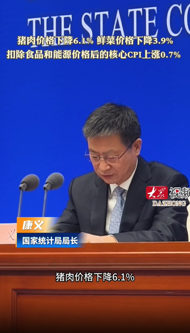 猪肉下降6.1%,鲜菜下降3.9%,2025年核心CPI温和回升大众新闻 12:04原创1月19日上午10时,国务院新闻办公室举行新闻发布会,介绍2025年国民经济运行情况,并答记者问。国家统计局局长康义介绍,在食品烟酒价格中,猪肉价格下降6.1%,鲜菜价格下降3.9%,粮食价格下降1.0%,鲜果价格上涨1.2%。扣除食品和能源价格后的核心CPI上涨0.7%,涨幅比上年扩大0.2个百分点。(大众新闻记者 董婉婉 吕乐)