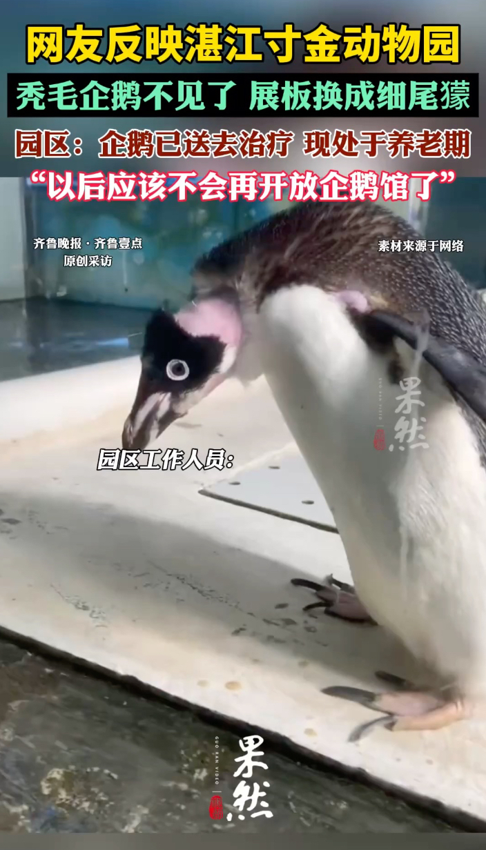 果然视频|网友反映湛江寸金动物园秃毛企鹅不见了,园区回应齐鲁晚报·齐鲁壹点客户端 10:50原创近日网友反映,广东湛江寸金动物园曾引发关注的“秃头企鹅”已不见踪影,其展区被挡板遮挡后,宣传内容已更换为狐獴。据此前报道,该企鹅因头部羽毛稀疏遭网友质疑饲养管理不善,园方曾回应为“正常换羽”。最新消息显示,这只13岁、处于养老期的企鹅,目前已被送往珠海治疗,园方拟将原企鹅馆改建为细尾獴馆,今后或不再开设企鹅展区。(齐鲁晚报·齐鲁壹点 杜嘉文)
