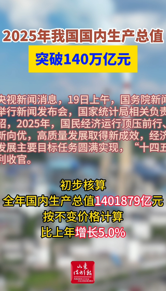 据央视新闻消息,19日上午,国务院新闻办举行新闻发布会,国家统计局相关负责人介绍,2025年,国民经济运行顶压前行、向新向优,高质量发展取得新成效,经济社会发展主要目标任务圆满实现,“十四五”胜利收官。初步核算,全年国内生产总值1401879亿元,按不变价格计算,比上年增长5.0%。