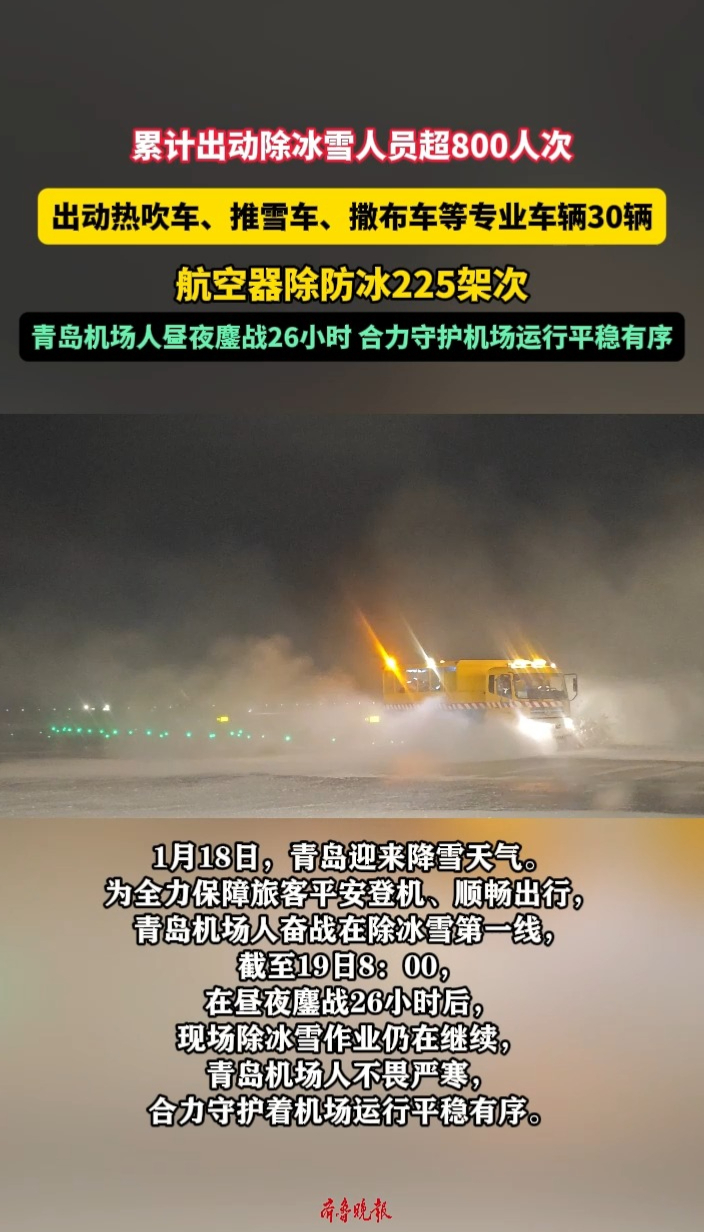 果然视频丨护航起飞!青岛机场人昼夜鏖战26小时除冰雪齐鲁晚报·齐鲁壹点客户端 12:04原创1月18日夜间至19日,青岛迎来降雪天气。为全力保障旅客平安登机、顺畅出行,截至19日8:00,在昼夜鏖战26小时后,青岛机场人奋战在除冰雪第一线,不畏严寒、众志成城,合力守护着机场运行平稳有序。 (齐鲁晚报·齐鲁壹点记者 尚青龙)
