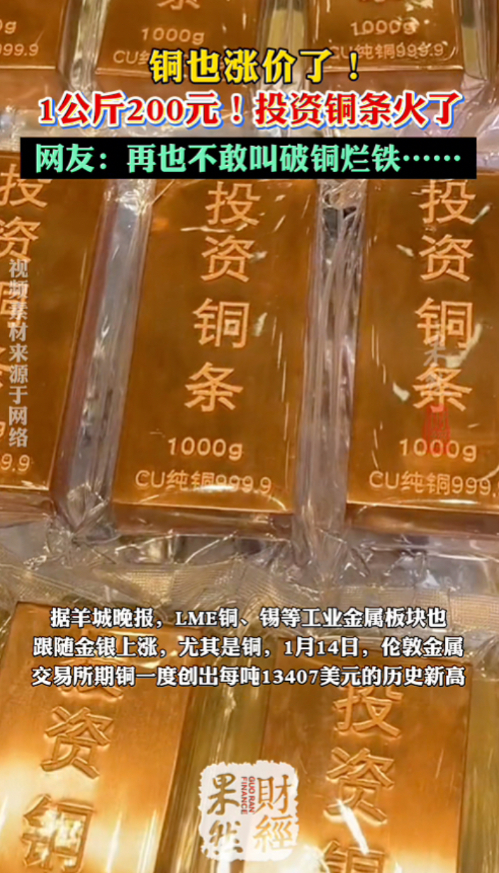 果然财经|铜也涨价了!网友:再也不敢叫破铜烂铁齐鲁晚报·齐鲁壹点客户端 14:01原创2026年伊始,贵金属延续去年强势涨势,短短两周内集体大幅飙升。特别是1月14日,现货黄金盘中刷新历史高位,达到4643美元/盎司,年内涨幅超7%。据羊城晚报,LME铜、锡等工业金属板块也跟随金银上涨,尤其是铜,1月14日,伦敦金属交易所期铜一度创出每吨13407美元的历史新高。在这股热潮之下,又一种金属悄悄“出圈”——投资铜条。最近,深圳水贝商家除了抢黄金和白银,推出了投资铜条。