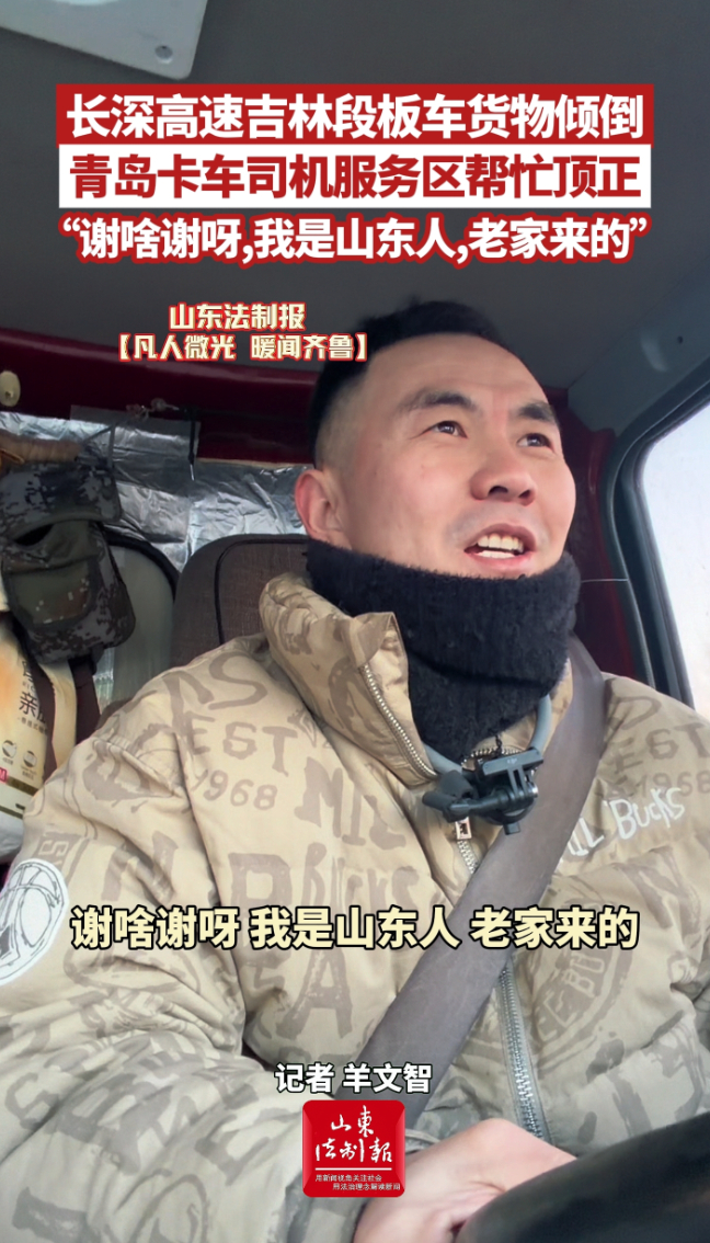 长深高速吉林段板车货物倾倒,青岛卡车司机服务区帮忙顶正,“谢啥谢呀,我是山东人,老家来的” 19:03 原创大众新闻·山东法制报 微信扫码扫码下载客户端1月16日,吉林长春,老家在青岛莱西的展先生驾驶卡车行驶在长深高速吉林段时,发现前方板车的货物即将掉落。他随即在前方服务区停下,果断用自己的卡车帮助板车司机将货物顶正。面对对方的物质感谢,展先生婉拒,表示:“谢啥谢呀,我是山东人,老家来的。”(大众新闻·山东法制报记者 羊文智)