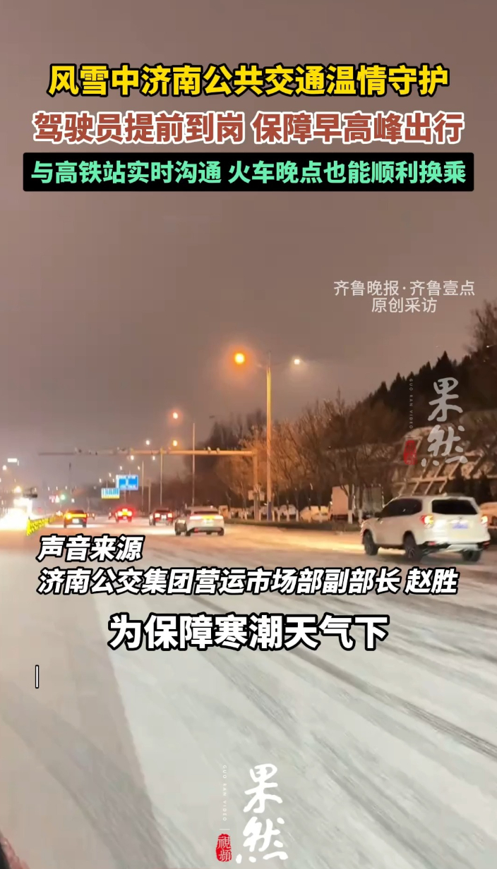 果然视频|风雪中济南公共交通温情守护,提前到岗保障早高峰出行齐鲁晚报·齐鲁壹点客户端 16:07原创1月19日,济南迎来2026年第一场雪后的早高峰。此前,省气象台发布了暴雪蓝色预警和道路结冰橙色预警,公共交通如何在雪天保障市民平安出行呢?济南公交集团营运市场部副部长赵胜告诉齐鲁晚报·齐鲁壹点记者,为保障寒潮天气下市民乘客的正常出行,工作人员提前做足准备工作,确保早高峰出全车、减少乘客候车时间。(齐鲁晚报·齐鲁壹点 郭辰昊 杜嘉文 实习生 李怡静)