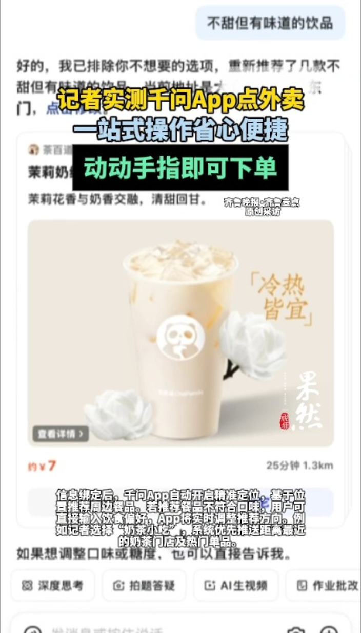 果然视频|实测千问App点外卖:从注册到下单,用时仅三十秒齐鲁晚报·齐鲁壹点客户端 16:07原创1月15日,千问App官宣全面接入淘宝、支付宝、淘宝闪购、飞猪、高德等阿里生态业务,实现服务场景扩容。1月19日,齐鲁晚报·齐鲁壹点记者针对其外卖点单功能进行实测,亲身体验一站式操作的便捷性。(齐鲁晚报·齐鲁壹点记者 崔可腾 实习生 赵钰灿)