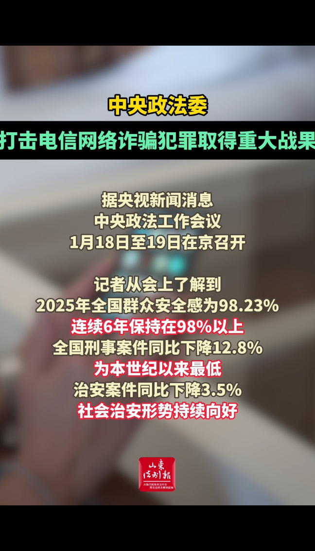 据央视新闻消息,中央政法工作会议1月18日至19日在京召开,记者从会上了解到,2025年全国群众安全感为98.23%,连续6年保持在98%以上。全国刑事案件同比下降12.8%,为本世纪以来最低。治安案件同比下降3.5%,社会治安形势持续向好。