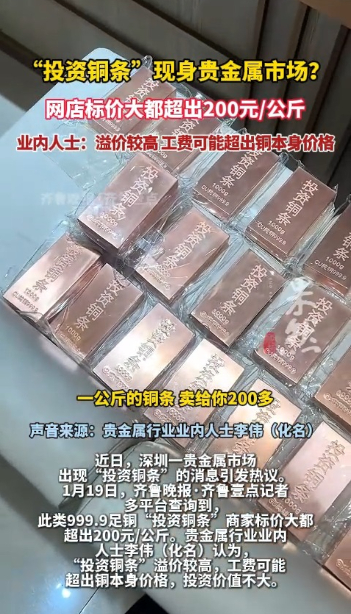 近日,深圳一贵金属市场出现“投资铜条”的消息引发热议。1月19日,齐鲁晚报·齐鲁壹点记者多平台查询到,此类999.9足铜“投资铜条”商家标价大都超出200元/公斤。贵金属行业业内人士李伟(化名)认为,“投资铜条”溢价较高,工费可能超出铜本身价格,投资价值不大。(齐鲁晚报·齐鲁壹点爆料电话:0531-85193656;邮箱:405617016@qq.com)
