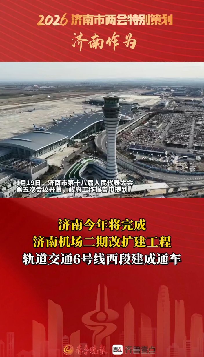 果然视频|济南今年完成机场二期改扩建工程齐鲁晚报·齐鲁壹点客户端 17:25原创1月19日,济南市第十八届人民代表大会第五次会议开幕,政府工作报告中提到,济南将完成济南机场二期改扩建工程,建成工业北路东延快速路,提速凤凰黄河大桥南延工程,新建改造岱北大道、物流大道等58条道路,打通8条断头(瓶颈)路。轨道交通6号线西段建成通车,加快7号线、9号线建设,推进三期规划编制。(齐鲁晚报·齐鲁壹点 管悦 王帮栋 见习记者 冯子芯)