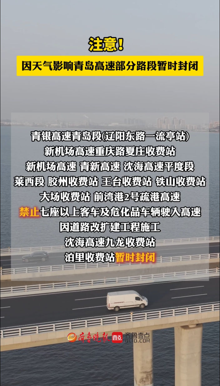 果然视频丨因天气影响,青岛高速部分路段暂时封闭齐鲁晚报·齐鲁壹点客户端 17:58原创因恶劣天气,青银高速青岛段(辽阳东路一流亭站)李沧北收费站出口老虎山隧道方向封闭,龙青高速青岛段只允许黄牌货车驶入高速(危化品车辆除外)。因道路改扩建工程施工,沈海高速九龙收费站、泊里收费站暂时封闭。 (齐鲁晚报·齐鲁壹点 曹婧雯)
