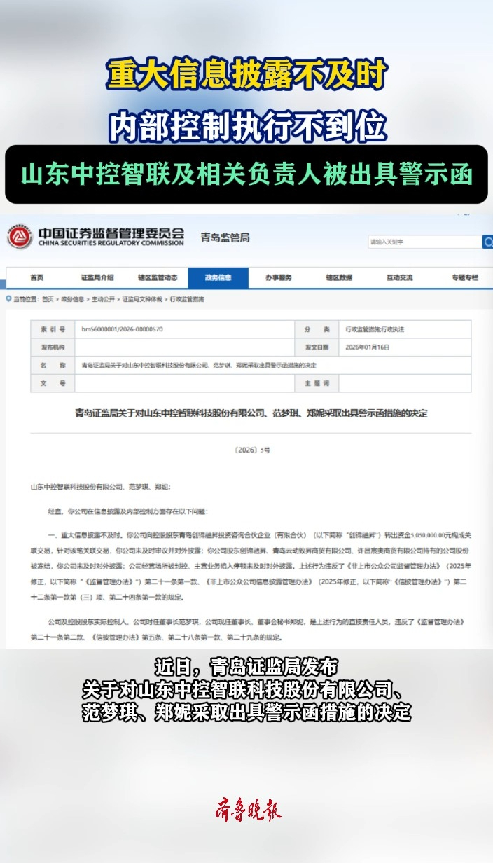 果然视频丨重大信息披露不及时,中控智联被出具警示函齐鲁晚报·齐鲁壹点客户端 17:59原创近日,青岛证监局官网发布关于对山东中控智联科技股份有限公司、范梦琪、郑妮采取出具警示函措施的决定。经查,中控智联存在重大信息披露不及时情况,同时还存在内部控制执行不到位情况。青岛证监局依照相关规定,决定对中控智联、范梦琪、郑妮采取出具警示函措施,并将相关情况记入证券期货市场诚信档案。 (齐鲁晚报·齐鲁壹点记者 尚青龙)