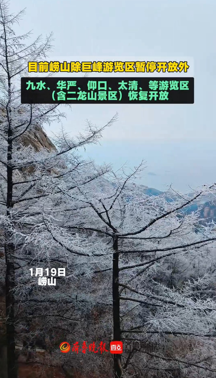 果然视频丨除巨峰游览区外,崂山其余区域雪后恢复开放齐鲁晚报·齐鲁壹点客户端 17:59原创1月19日,据崂山风景区最新消息,目前除巨峰游览区暂停开放外,其他游览区(含二龙山景区)恢复开放。到景区游览的游客,请尽量穿戴专业防滑装备,做好防风保暖准备,在欣赏美景和拍照时注意脚下安全,结冰危险路段请勿前往。 (齐鲁晚报·齐鲁壹点 台雪超)