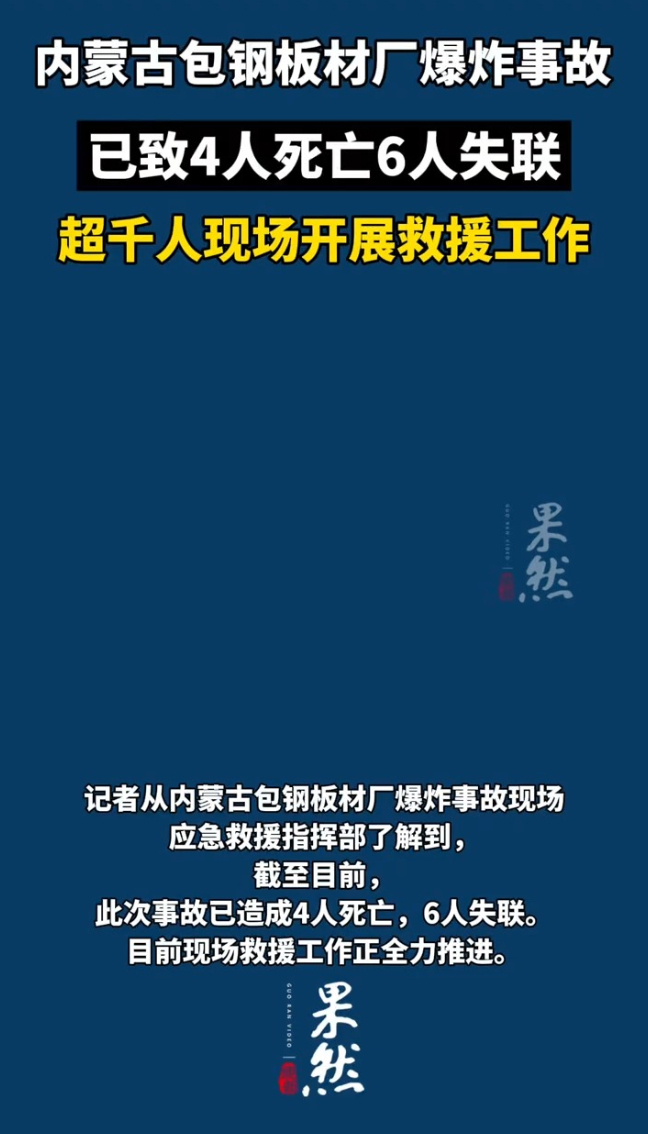 内蒙古包钢板材厂爆炸事故已致4人死亡6人失联