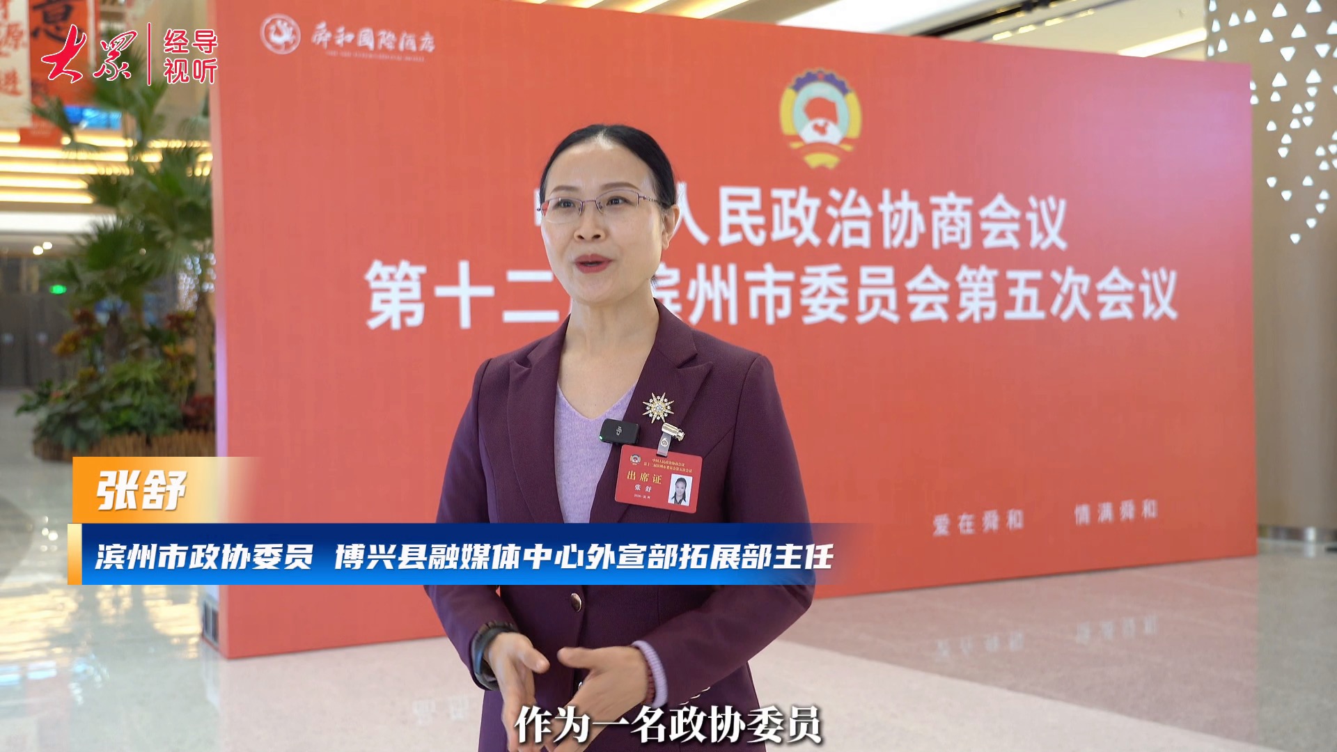 1月19日上午,中国人民政治协商会议第十二届滨州市委员会第五次会议在黄河三角洲交易中心隆重开幕。在分组讨论环节,记者采访了滨州市政协委员、博兴县融媒体中心外宣部拓展部主任张舒,她表示,作为一名政协委员,一名新闻工作者和民盟盟员,会一边用笔杆讲好滨州民生改善故事,让“滨周到”品牌更深入人心,一边紧盯群众诉求,深耕调研,把“家长盼”转化为“委员言”,为让滨州家庭更安心贡献力量。(朱明)