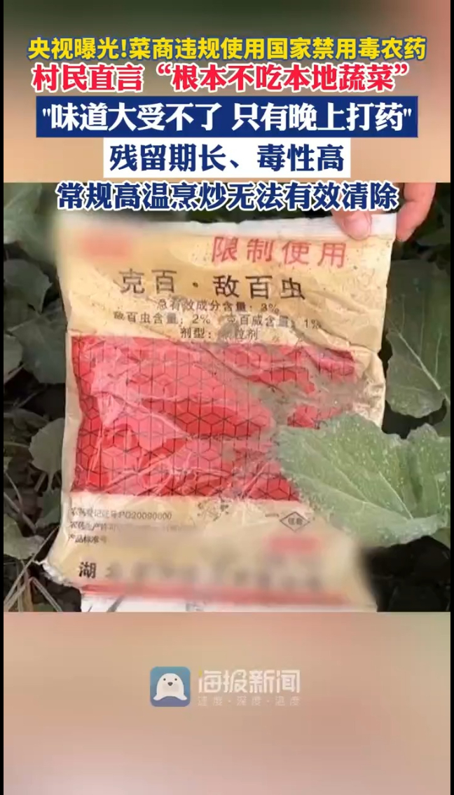 近日,央视记者暗访发现,湖北天门岳口镇部分菜农,竟在深夜使用国家明令禁止的剧毒农药克百威种菜!村民捂着鼻子诉苦:“味道大得受不了,只能晚上偷偷打药。”更令人心惊的是,当地村民直言:“我们自己根本不吃这片地里的菜!”
