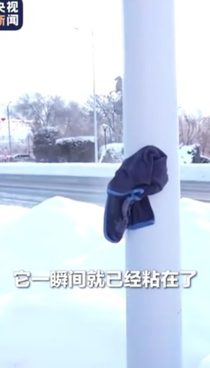 -34℃!毛巾一秒粘柱子,网友:冬天不能舔栏杆原因找到了央视新闻 07:00近期,寒潮来袭,新疆阿勒泰出现-34℃的寒冷天气。 记者实地探访发现,一条打湿的热毛巾能瞬间“粘”在路灯杆上,水在滴下的过程中就已变成冰柱。将毛巾展开,它立刻就被冻到可以“站”在雪中。 (央视新闻)